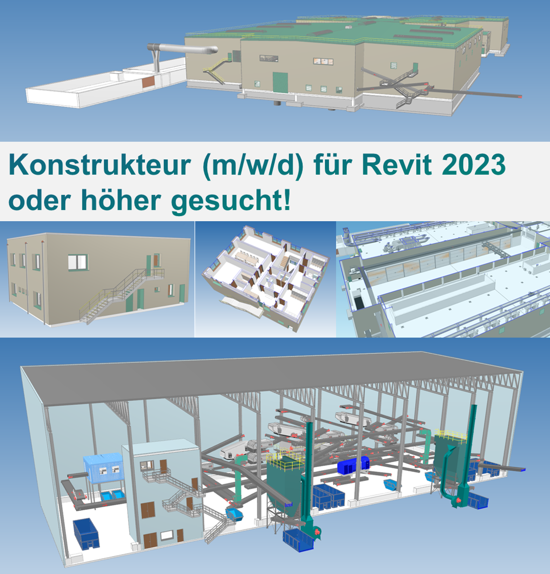 Konstrukteur (m/w/d) für Revit 2023 oder höher gesucht! Wir suchen ab sofort ein weiteres Teammitglied für unsere Konstruktionsabteilung. Bevor Recyclinganlagen und Anlagen zur Erzeugung erneuerbarer Energien errichtet werden können, müssen diese ausgelegt und geplant werden. Wir suchen hierfür ab sofort weitere Unterstützung unserer Konstruktion für Planungen mit dem Programm Revit. In den folgenden Bildern stellen … mehr lesen